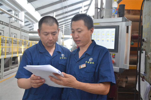 花布車間現(xiàn)場(chǎng)主管紀(jì)方超(右)與焙烘機(jī)機(jī)長(zhǎng)孫海雷,在查看金粉印花生產(chǎn)質(zhì)量。