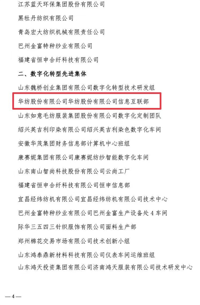 近日,中國(guó)紡織工業(yè)聯(lián)合會(huì)、中國(guó)財(cái)貿(mào)輕紡煙草工會(huì)全國(guó)委員會(huì)聯(lián)合發(fā)布了《關(guān)于2023年全國(guó)紡織行業(yè)數(shù)字化轉(zhuǎn)型勞動(dòng)競(jìng)賽結(jié)果的通報(bào)》,公司憑借2023年在數(shù)字化轉(zhuǎn)型方面的不斷探索與創(chuàng)新被評(píng)為“數(shù)字化轉(zhuǎn)型先進(jìn)企業(yè)”,公司信息互聯(lián)部被評(píng)為“數(shù)字化轉(zhuǎn)型先進(jìn)集體”,公司黨委書(shū)記、董事長(zhǎng)盛守祥先生被評(píng)為“數(shù)字化轉(zhuǎn)型先進(jìn)個(gè)人”。