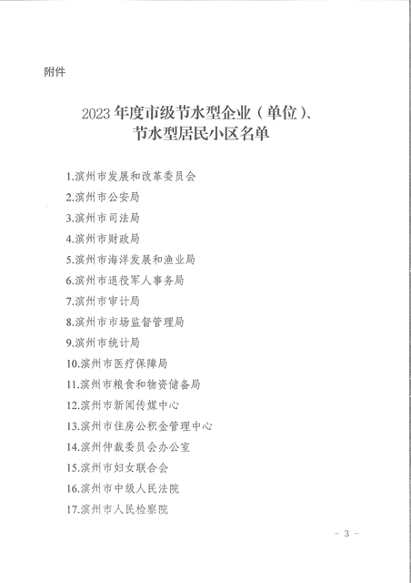 近日,濱州市城鄉(xiāng)水務局、濱州市發(fā)展和改革委員會、濱州市工業(yè)和信息化局、濱州市住房和城鄉(xiāng)建設局、濱州市機關政務保障中心發(fā)布了《關于公布2023年度市級節(jié)水型企業(yè)(單位)、節(jié)水型居民小區(qū)評價結果的通知》,經綜合評價,公司達到市級節(jié)水型企業(yè)(單位 )、節(jié)水型居民小區(qū)標準要求,獲評2023年度濱州市節(jié)水型企業(yè)。